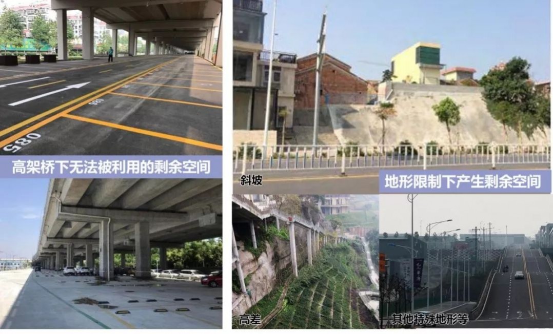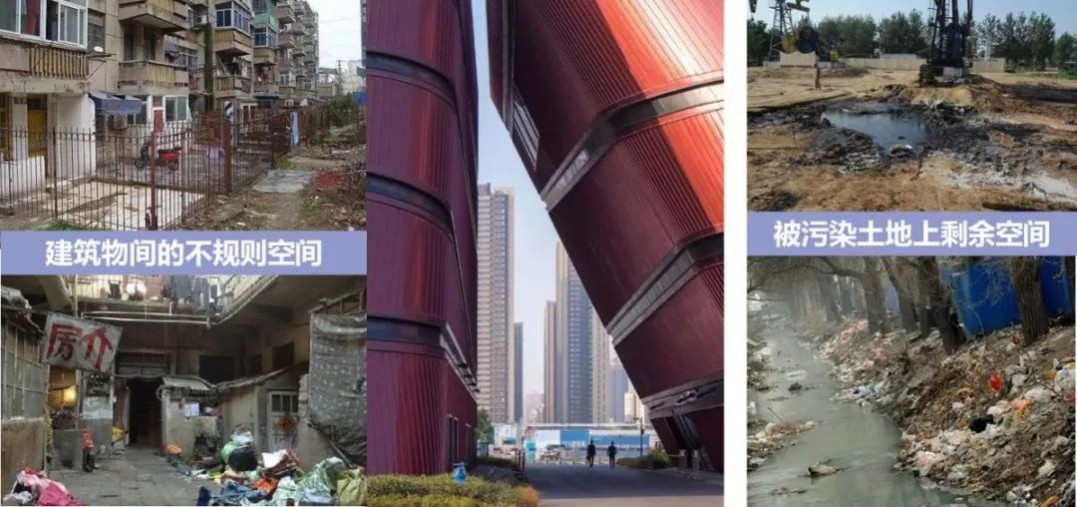 建筑物間的不規(guī)則空間、被污染土地上的剩余空間、高架橋下無法被利用的剩余空間、地形限制下產(chǎn)生的剩余空間、原有用途改變后被廢棄的空間。