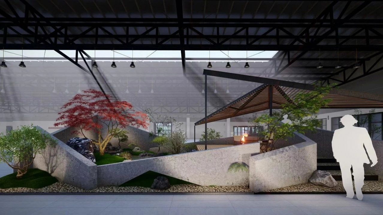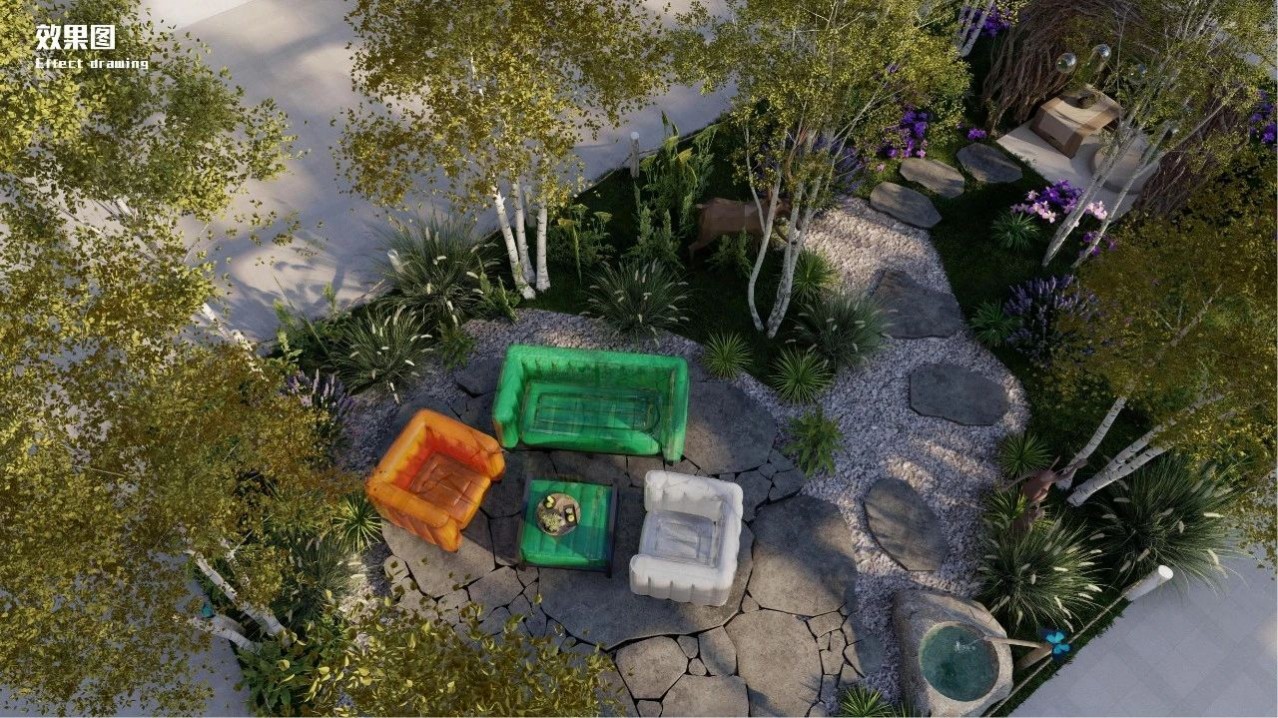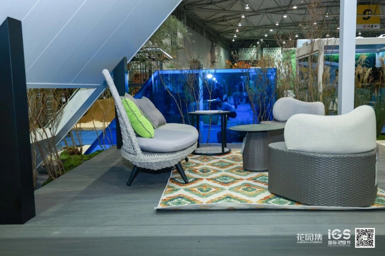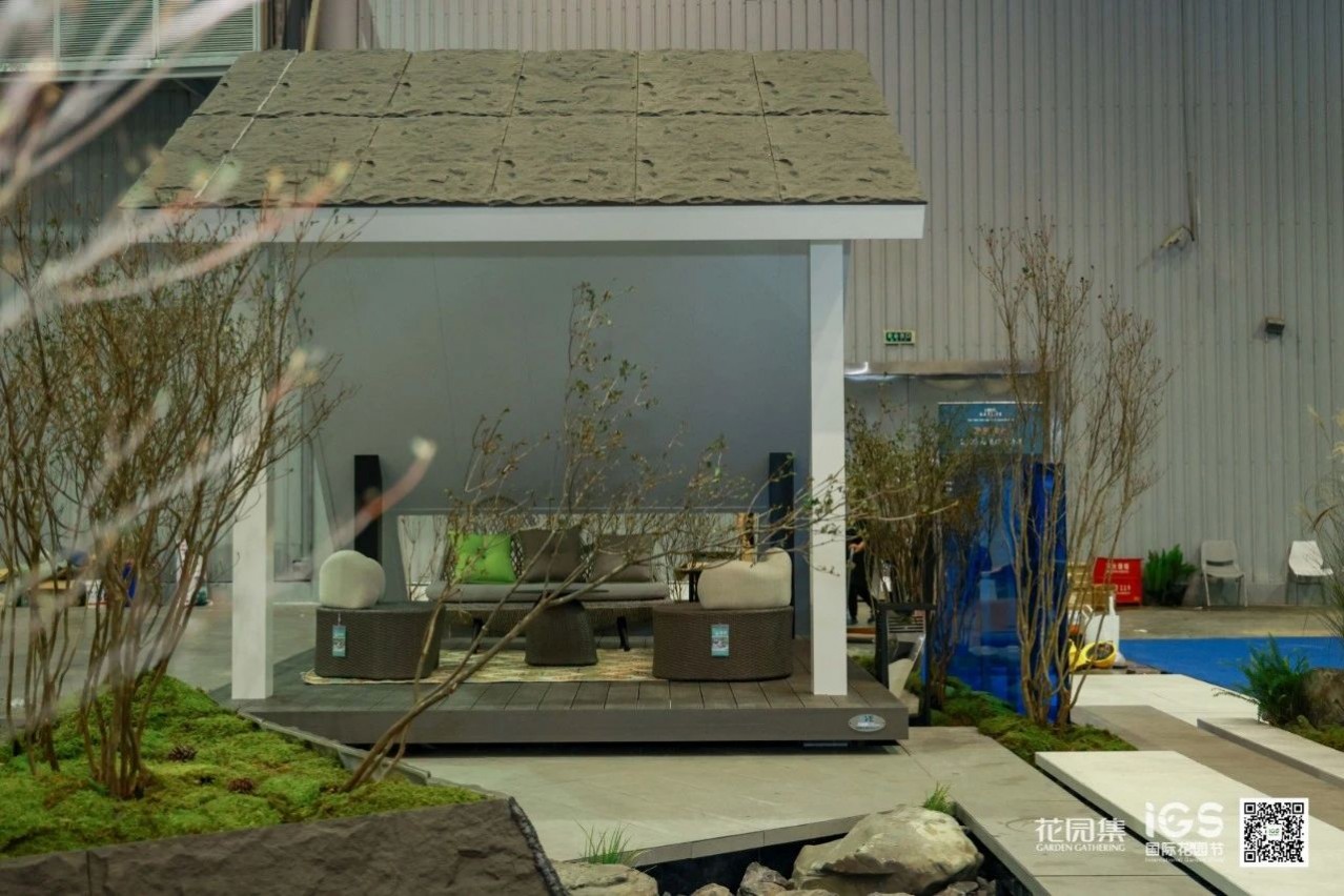空間承載并展示了休閑、聚會、烤火等庭院常用的三大功能。這樣的展示設(shè)計貼近生活,詮釋了花園的生活意義。