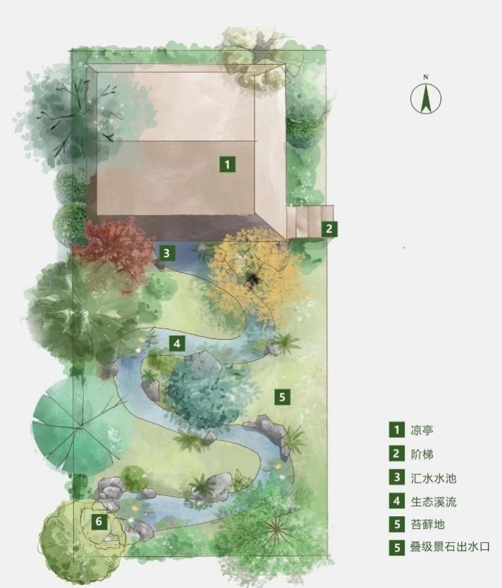 以四川自然溪流為樣板,首先在出水口上以山泉流出,然后宛然曲折流入小池塘中。水系周邊以自然山溪為藍本自然景石和苔蘚植物收邊,自然散置的小喬木點綴其中。