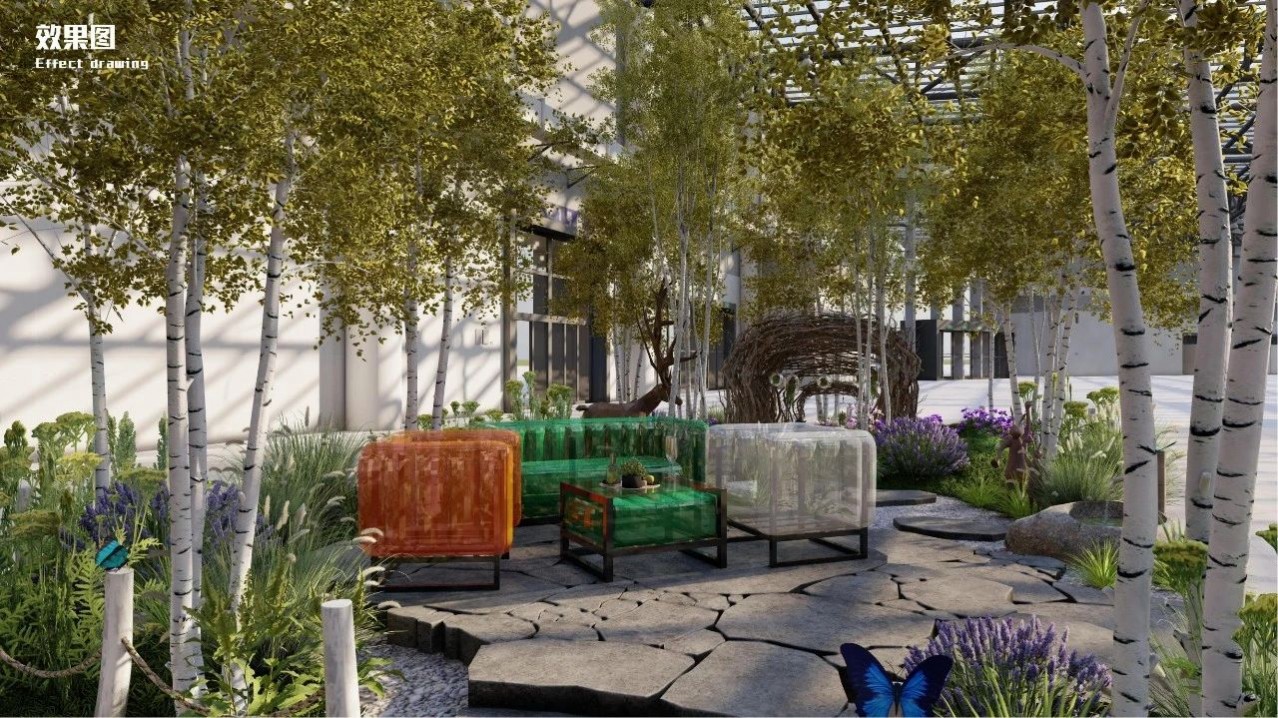 選用帶著遠方鮮意的白樺林進行自然山林空間造景,讓人們仿若置身于白樺林浪漫的秋色中。由設(shè)計師親自手作的安全島將成為白樺林中的冥想地,拙樸野趣自然,在音樂和梵香中,讓人靜下來自由冥想放松……精致而富有創(chuàng)意的生態(tài)缸點綴林間,蘊含生機活力,傳遞植物“家”的力量……