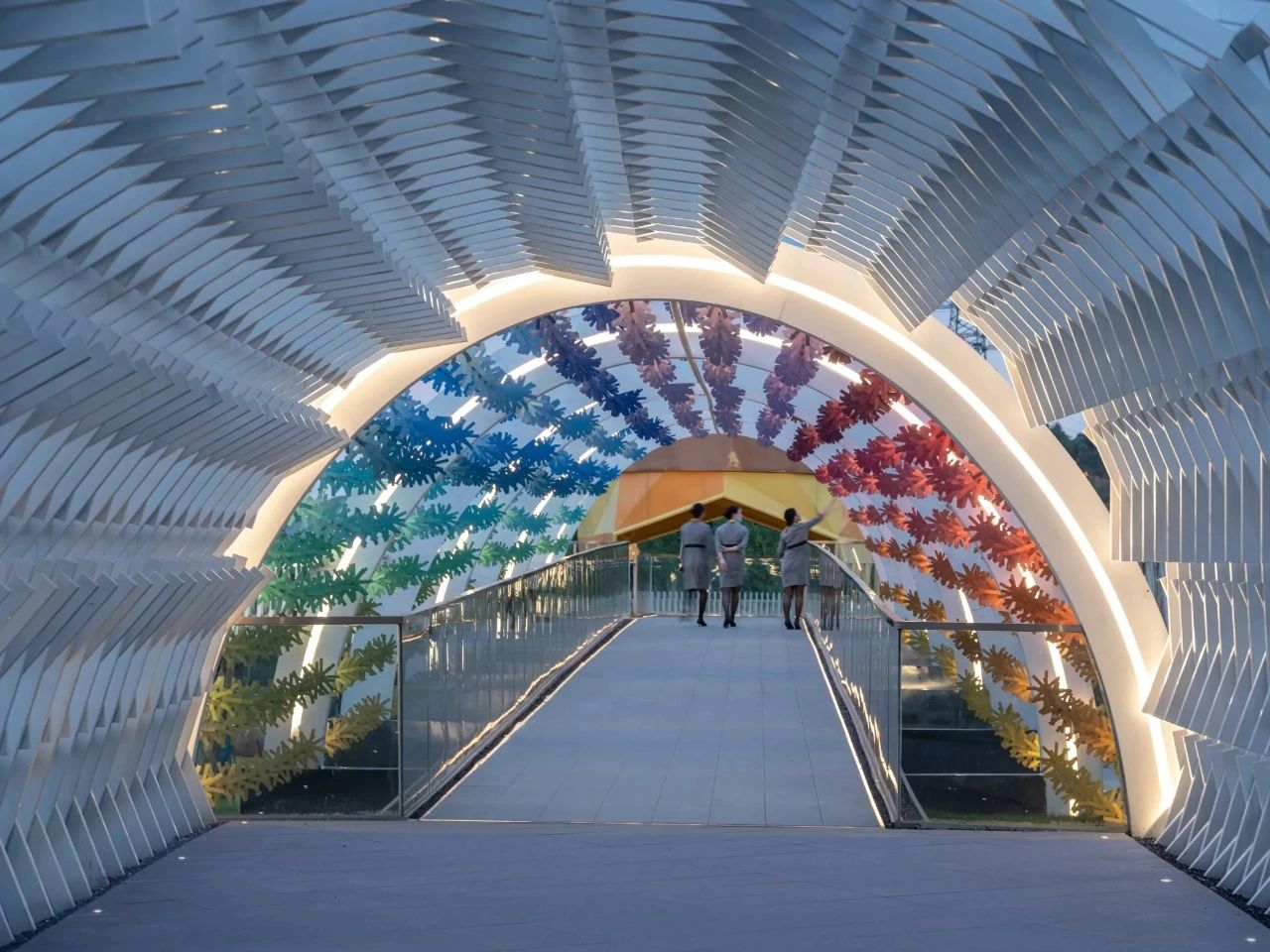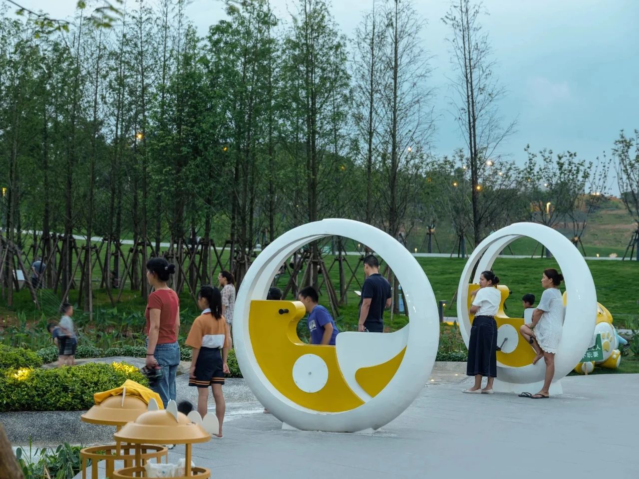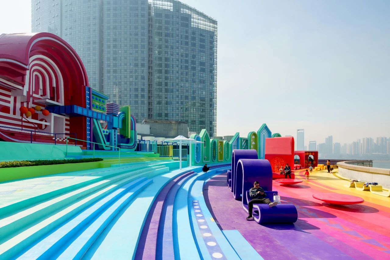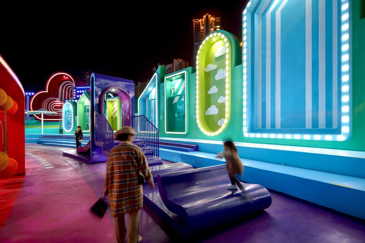 在整個彩帶系統(tǒng)中,有些彩帶從地面拔高而起,形成了一個大型的露天劇場,從而更好的利用了湘江美景,有些則延伸成豎向的膠囊房子,不僅能以有趣的造型與圖案快速吸引游客的注意力,同時提供了自拍和社交媒體發(fā)布的絕佳場景。