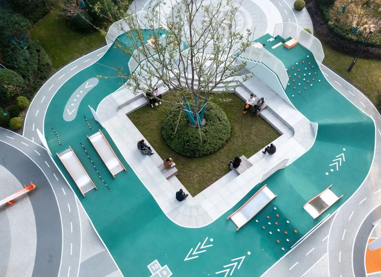 為了讓周圍樓的居民都能看到、辨認(rèn)和可讀,設(shè)計師用醒目的藍(lán)綠色創(chuàng)造了一個巨大的漢字,然后把它變成了一個游樂場。當(dāng)書法筆畫被幾何化時,非常適合成為充滿障礙挑戰(zhàn)性和有趣功能性的游樂活動方式,以鼓勵社交互動。因此,它的名字,M?(my)Way-做我想做。