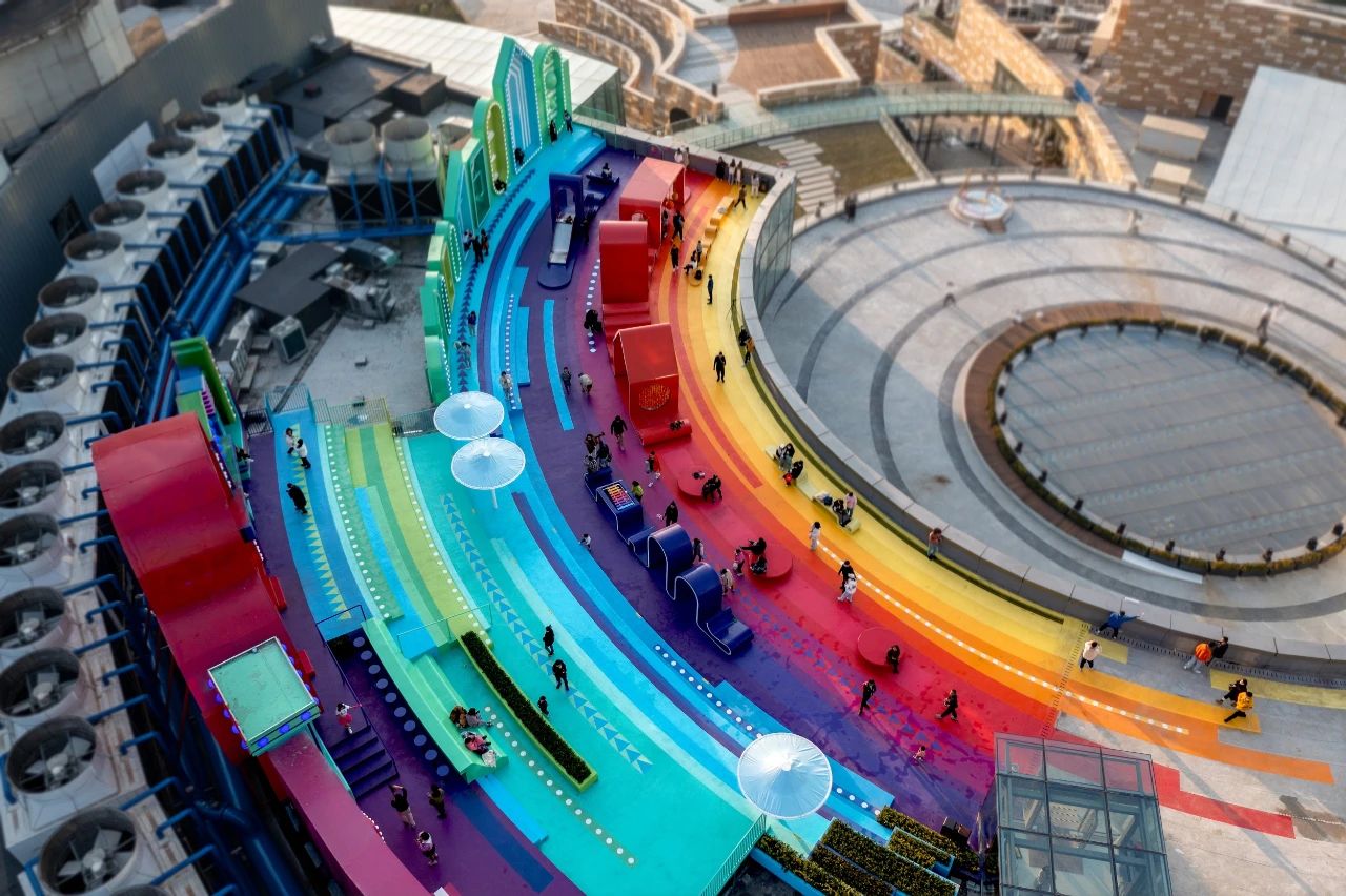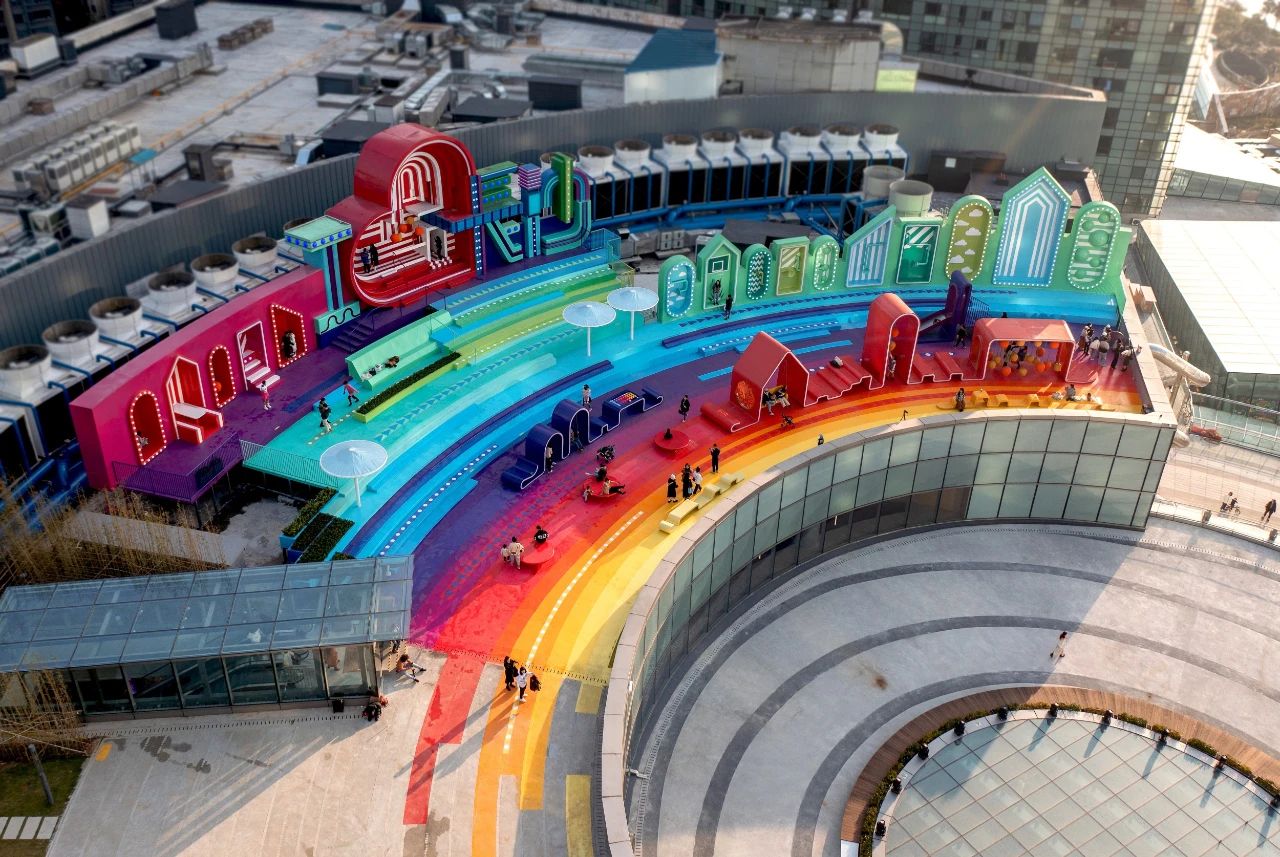 “彩虹之上”是一個以彩虹為設(shè)計靈感的、極度吸睛的高顏值屋頂公共空間改造項目。它坐落于湖南最大的城市-省會長沙,是整體商業(yè)樓體改造項目的一部分。