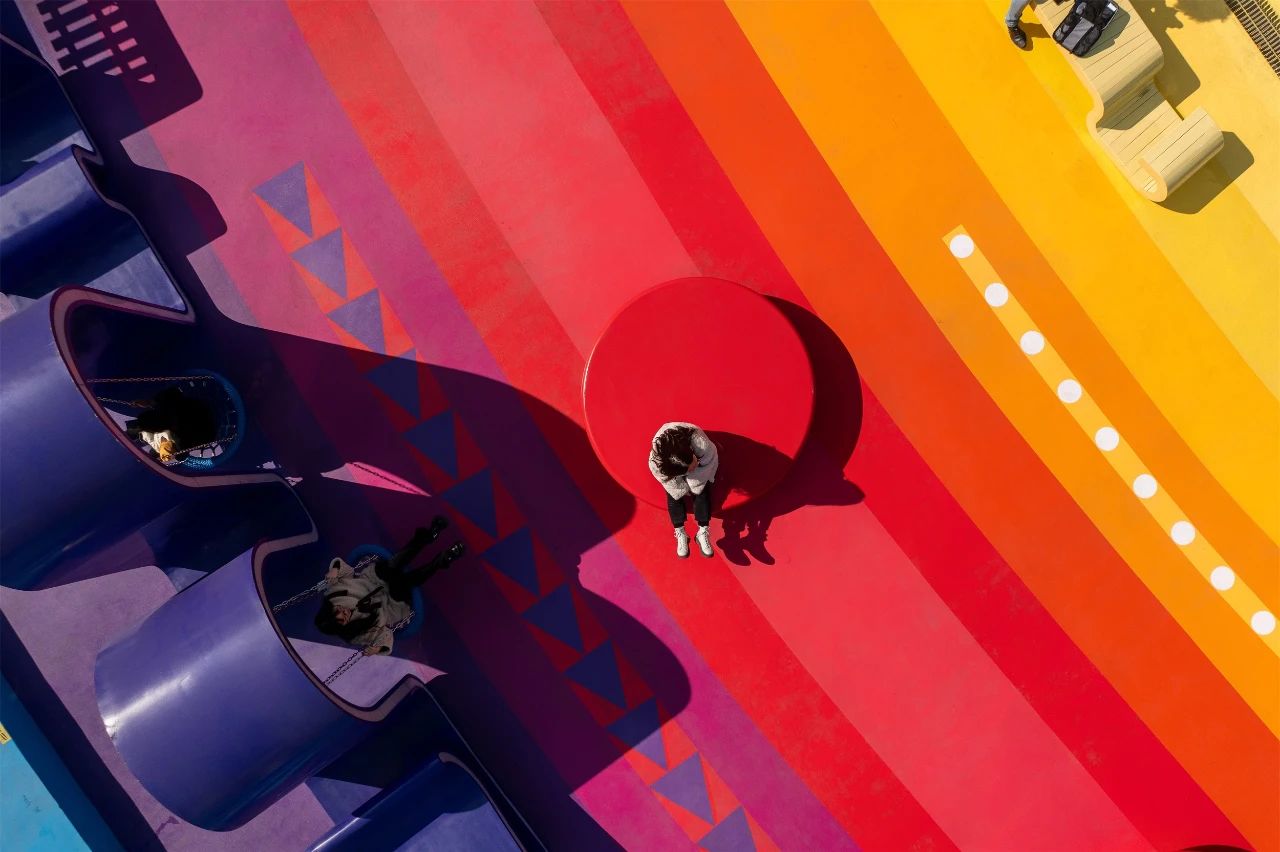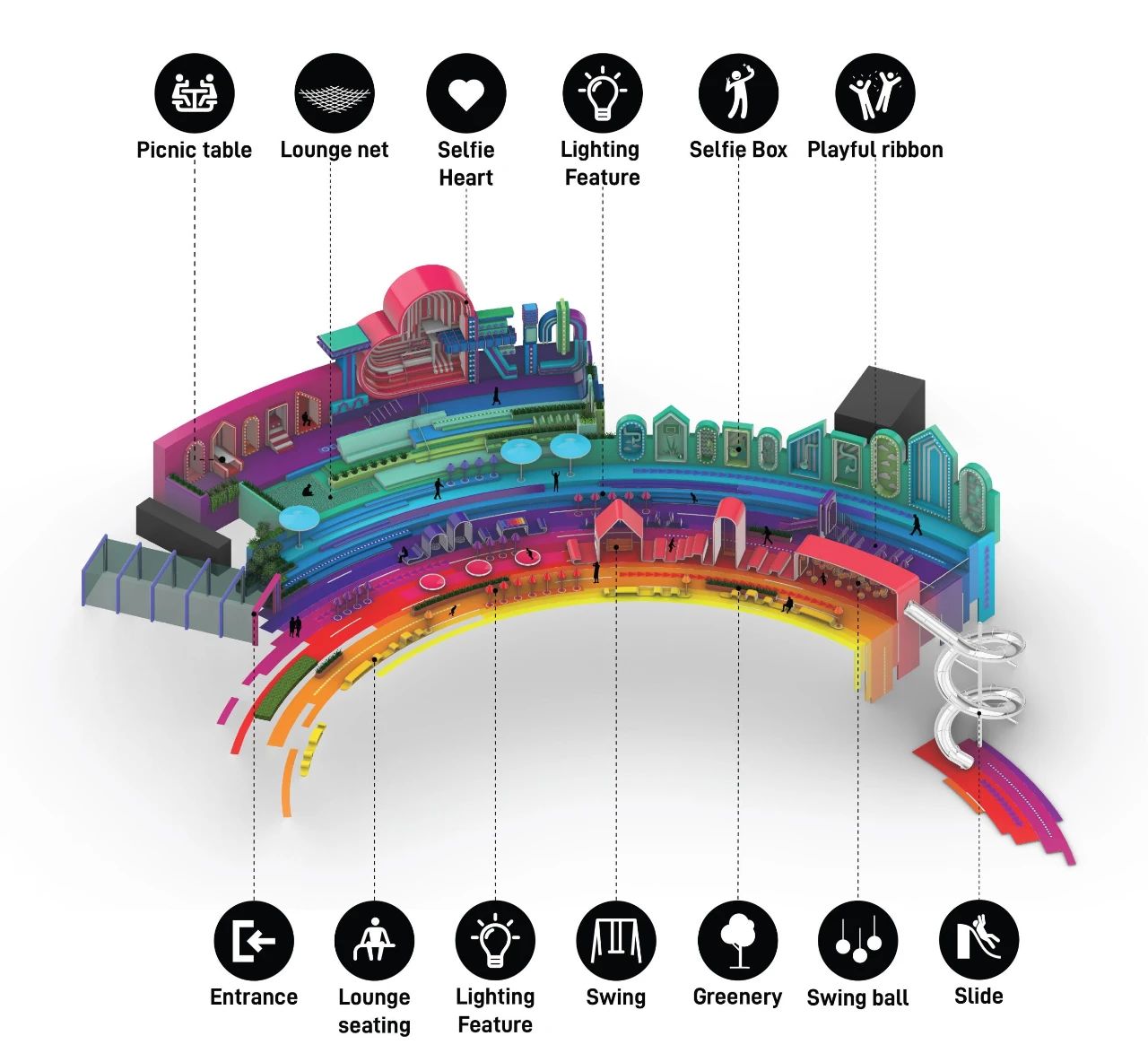 利用屋頂圓弧的造型,設(shè)計師用不同顏色的彩帶平行地鋪滿地面,增強弧形的視覺效果,從而形成了一道設(shè)置了多項互動活動功能的絢麗彩虹。每條彩帶都被賦予了不同的顏色,承載了不同的功能和活動,通過休閑與活動,促進社交與互動。這些彩帶既作為流線地面二維圖案引導(dǎo)人行動線,同時在局部隆起部分變?yōu)槿S的城市家具、游玩結(jié)構(gòu)與休閑裝置。