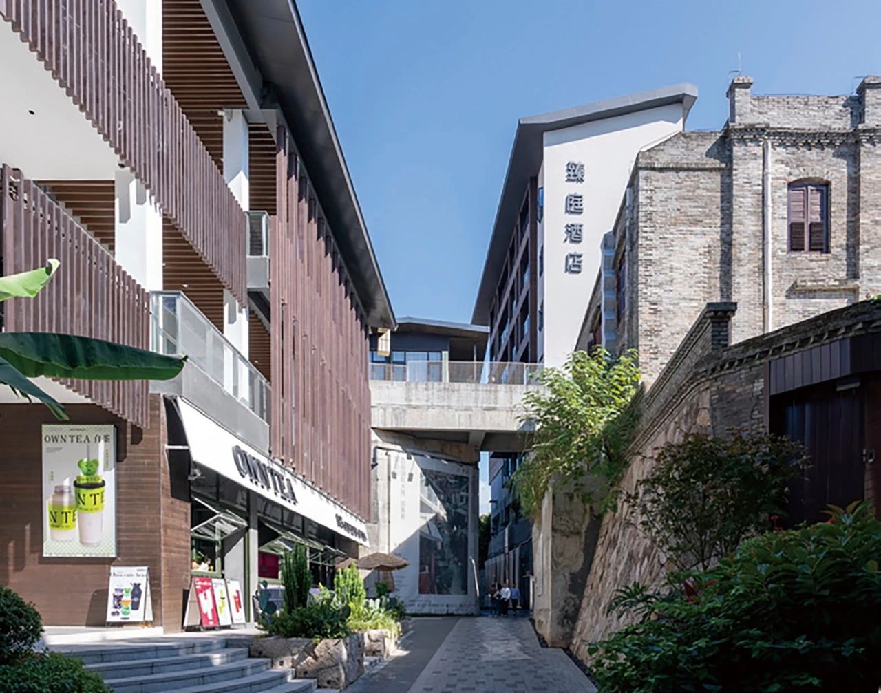 可能性案例2:對間隙的利用。除了像鹽倉那樣刻意地營造保留下來的老建筑與新建筑之間的空間對話外,許多老建筑與新建筑之間只是一種偶然的并置關(guān)系,滿足規(guī)范規(guī)定的必要防火間隔,在建筑設(shè)計階段并沒有形成刻意的對話。然而正是這種間隙,為未來的可能性留出了余地。尤其是坡地帶來的臺階狀的地形,會形成幾個似乎沒有什么關(guān)系的建筑物之間的活力連結(jié),當(dāng)這個空間被激活,周邊的店面就會自動組織成一個主題聚落。這種無為而為、無用而用的留白做法,更容易在不損害真實性的前提下,讓時間去塑造完整性(圖21)。