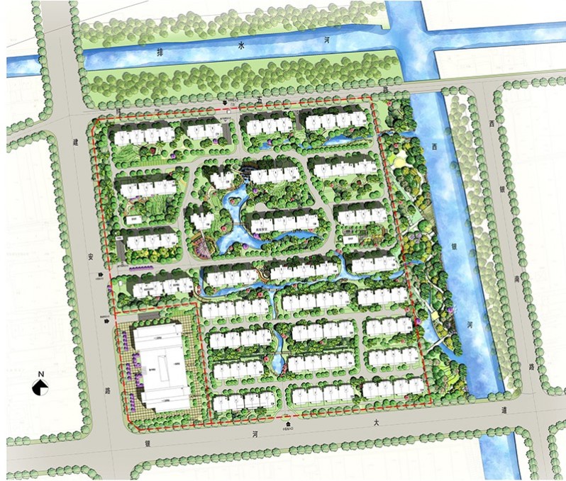 本地塊位于揚(yáng)州市西南分區(qū),寧通高速與建安路交叉口的東南角。北至規(guī)劃緯五路,南至銀河大道,西沿建安路,東側(cè)為西銀河及沿河景觀帶??偨ㄖ娣e16.41萬平方米。在總體的空間布局上,建筑由疊加洋房住宅和小高層住宅組成,整體上形成了南低北高的建筑態(tài)勢。并以一條景觀水系將兩者適當(dāng)分隔。立面風(fēng)格上以新古典風(fēng)格為基調(diào)并融入揚(yáng)州傳統(tǒng)建筑的元素,強(qiáng)調(diào)簡潔明快的色彩效果。建筑形式和色彩與周圍環(huán)境協(xié)調(diào),并盡力打造良好的沿建安路,銀河大道的城市界面。